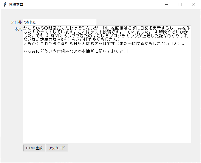 かねてからの懸案だったわけでもないが HTML を直接触らずに日記を更新するしくみを作ったのでテストしています。これはテスト投稿です。つかれました。 4 時間ぐらいかかった。でも 4 時間ぐらいでできたのはむしろプログラミングが上達した証なのかもしれないな。数年前なら 3 日ぐらいかけてたかもしれん。